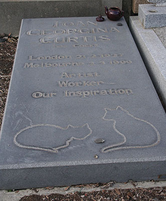 On our way out we passed a tombstone in memory of local artist Joan Curtis. It’s touchingly adorned with a real teapot and the outlines of two cats. There’s a homeliness to this which tells you more about the person than religious iconography. The Egyptian pharaohs used to travel into the next world accompanied by food, jewels and servants, so why not a teapot and cats?