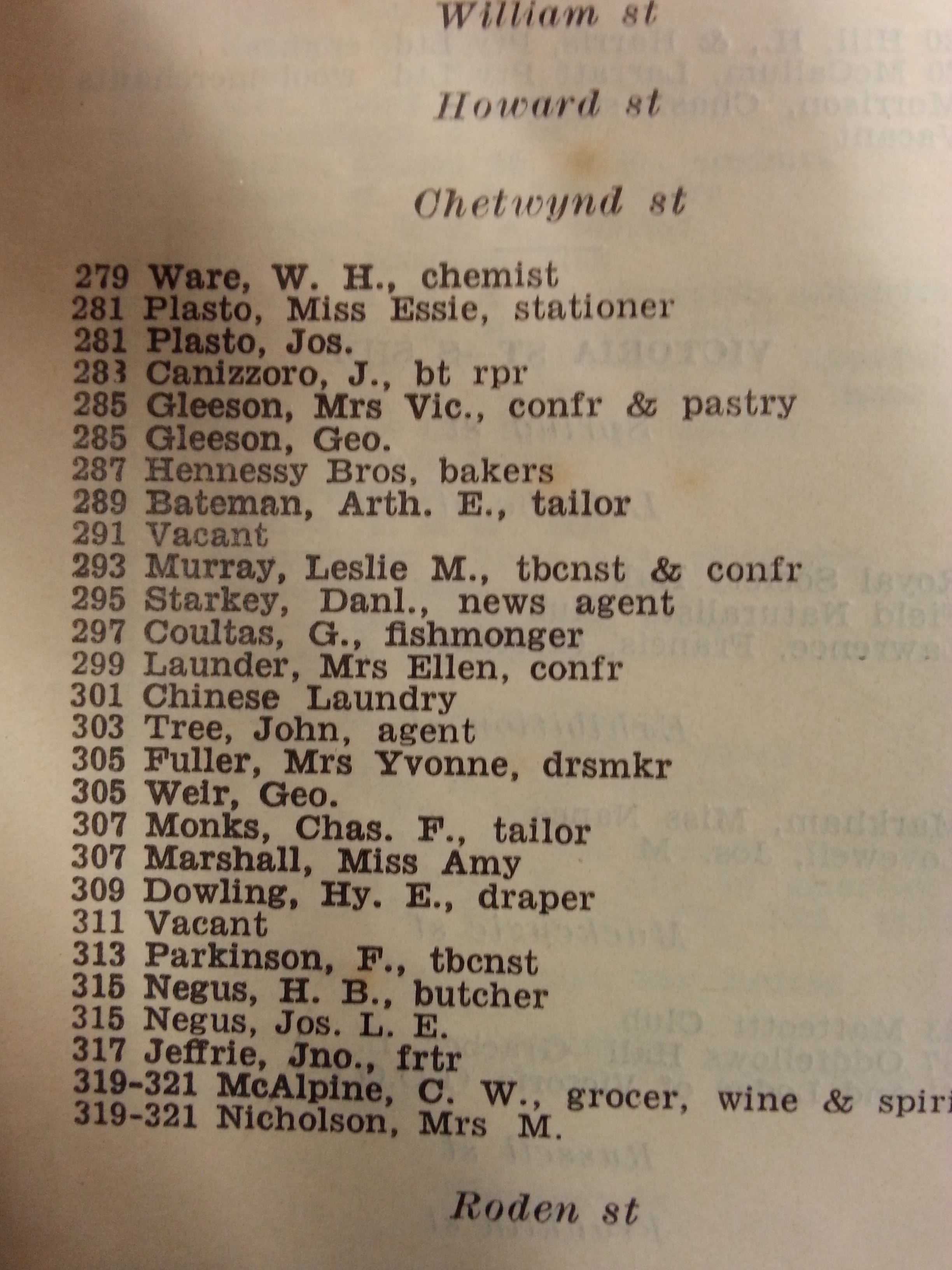 I took a quick look in the 1930 Sands & McDougall directory. The Hennessys were at 287, and Daniel Starkey, news agent was selling the Herald and The Age at 295. It’s interesting to note there were several dressmakers and tailors in the vicinity, who might have required the services of a Wertheim sewing machine. A bit more research would be needed to date the signage with any confidence. I haven’t got around to it yet. But this entry in Sands & Mac gives a nice snapshot of the trades in that part of Victoria Street, between Chetwynd and Roden streets, in 1930.