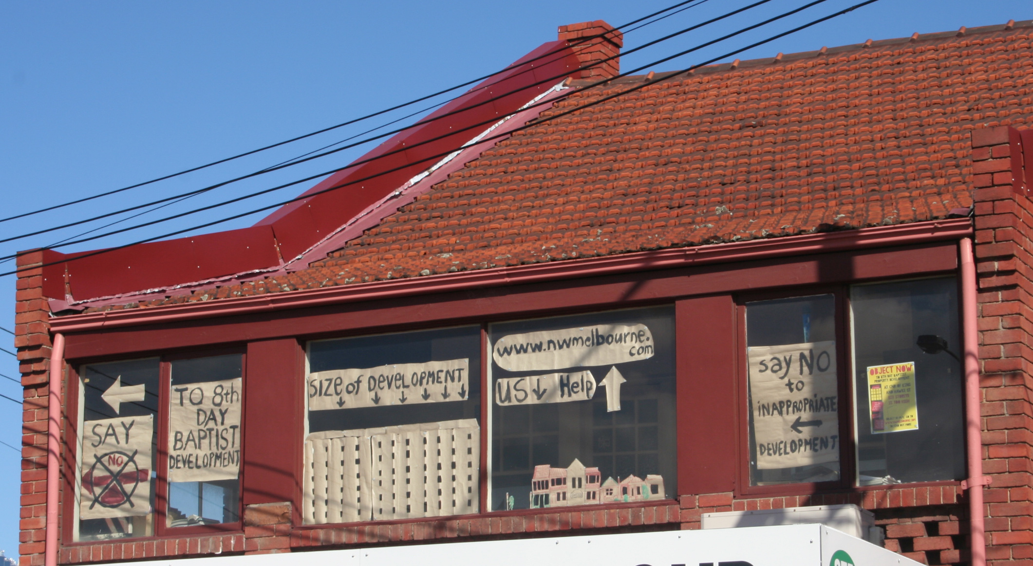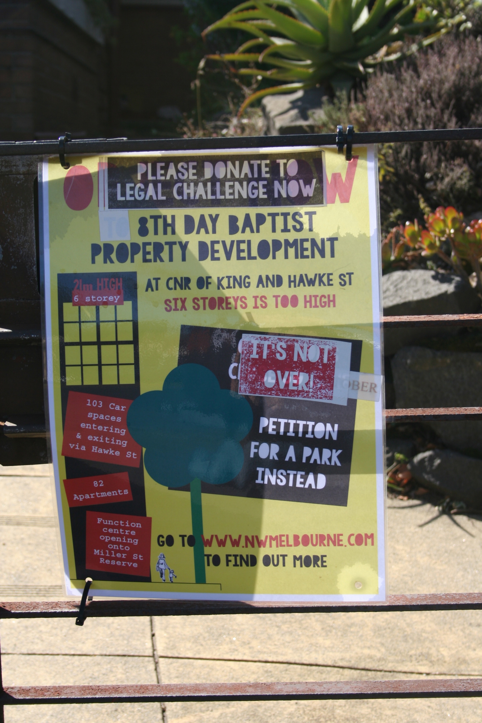As you head up the hill, there are terraces of small Victorian cottages, and a couple of nice bluestone houses. These days the city is experiencing a new property boom and the people of North Melbourne are making their feelings known about it.