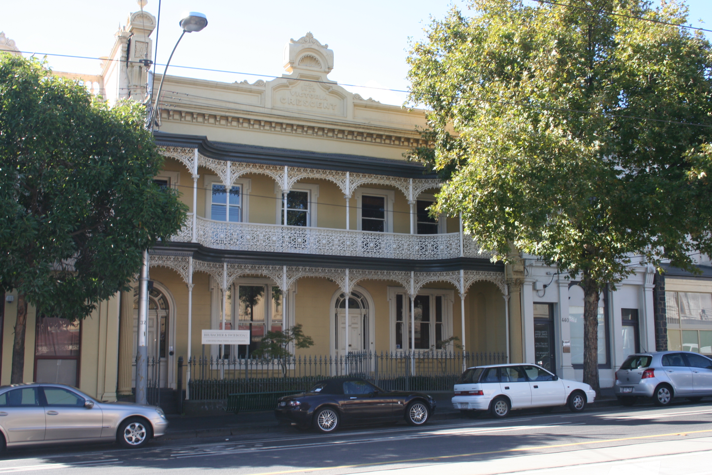 At 442 there’s an impressive example of an upmarket Victorian terrace with oceans of decorative cast iron. It’s reminiscent of some of the mansions I saw a few weeks ago walking through Essendon and Moonee Ponds, but there isn’t a lot of this sort of thing closer to the city centre. Much of it was destroyed in the mid-20th century.