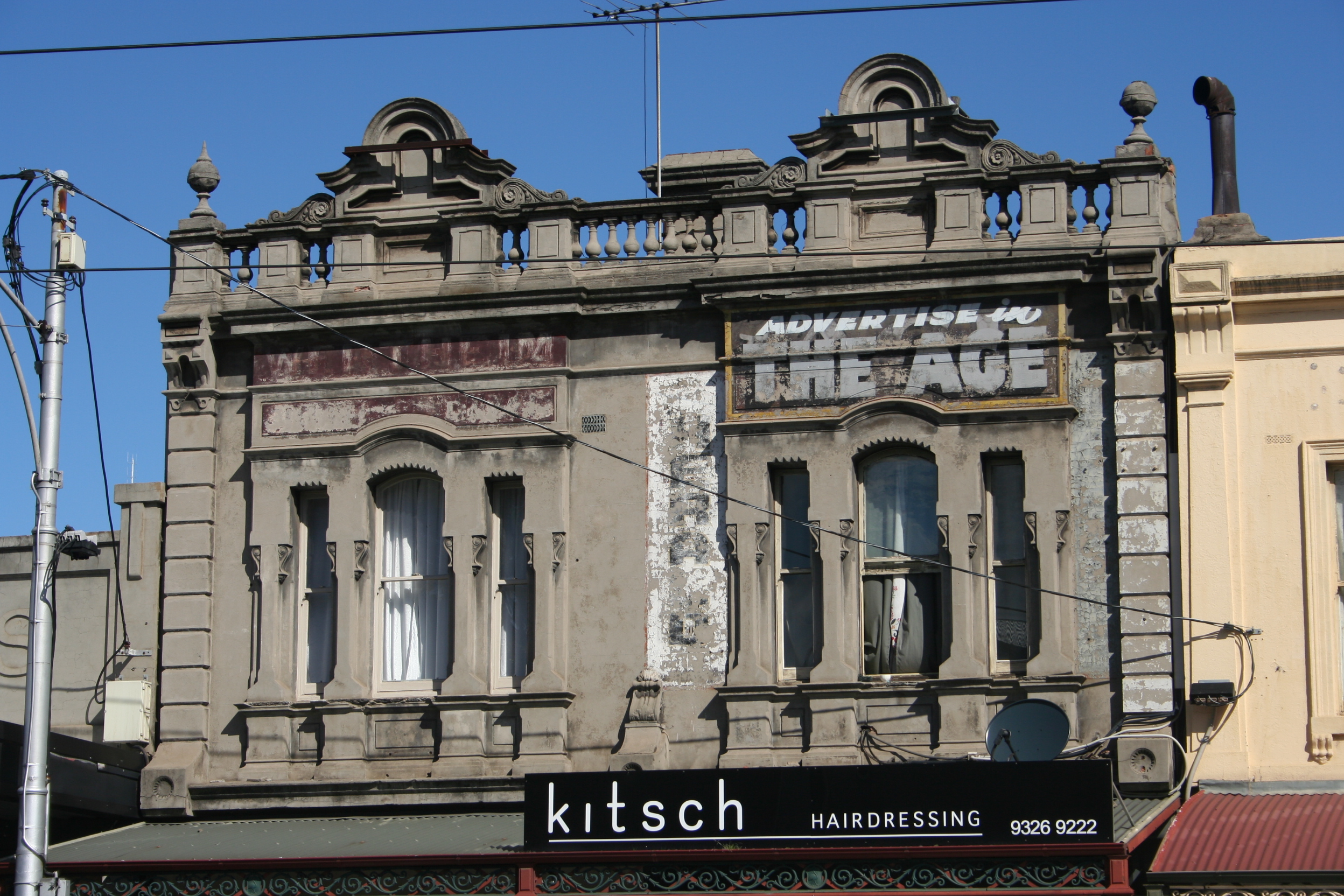 A little further down at no. 293-295 is a Victorian shop with ghostsigns for Wertheim (on the left), The Herald and The Age. Hugo Wertheim was a German migrant to Australia in the late 19th century, an importer of sewing machines and other mechanical devices, and the first maker of pianos in Victoria in the early 20th. Unfortunately the words under the Wertheim name are too faded to make out.