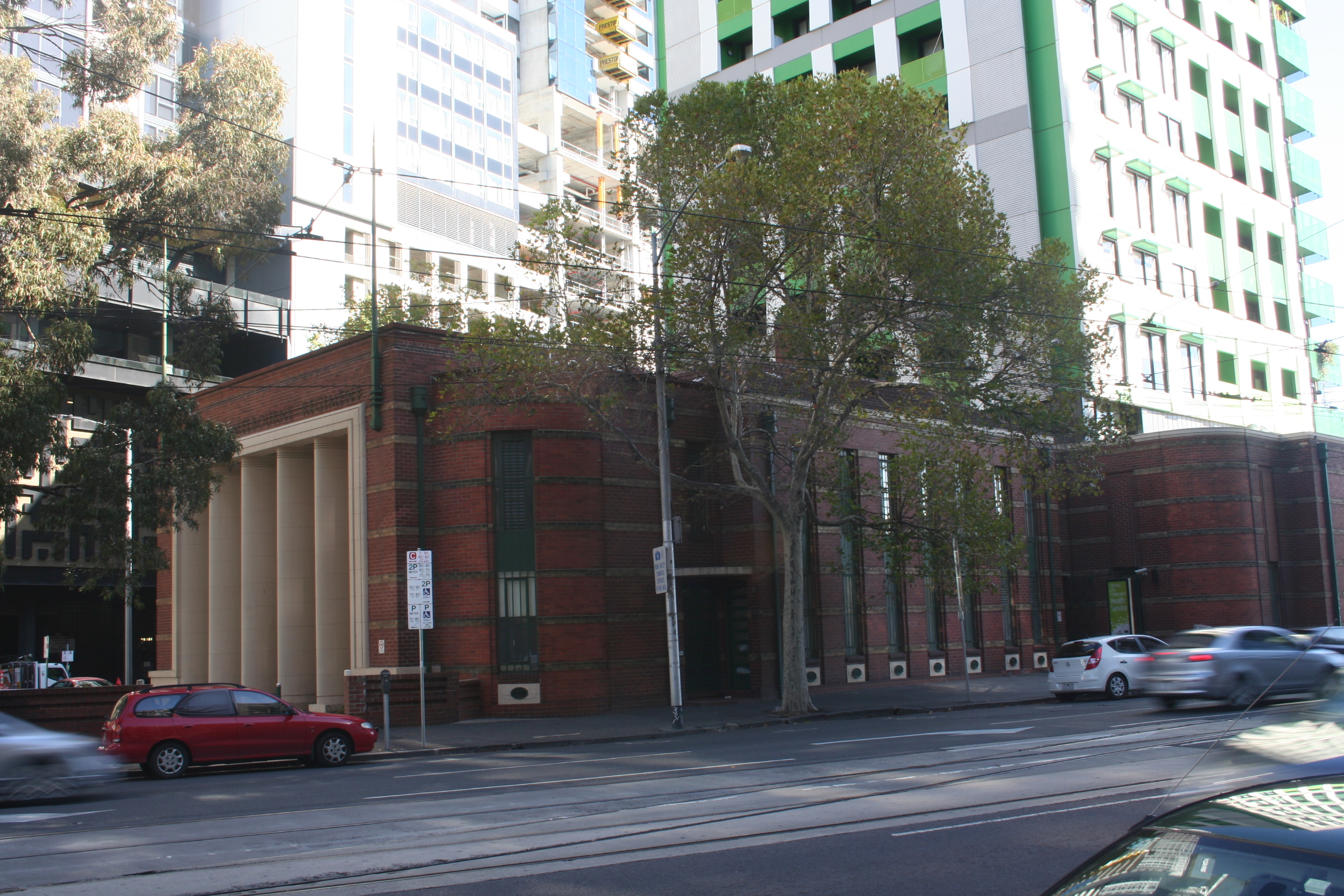 A little further along on Victoria Street, backing onto Therry street, is The Royal Melbourne Regiment 6th Battalion Drill Hall – one of the best public buildings built by the Commonwealth in Melbourne. Originally this sizeable triangular building it was not only a Drill Hall but also contained areas for regimental stores, an armoury, lecture halls and so on. These days it’s occupied by a mixture of retail (groceries, waxing salons) and services (a health centre, a multicultural hub). Unfortunately its stylish moderne design is now overshadowed by monstrous skyscrapers, and some hideous green box apartments have been plonked on top of the Drill Hall itself. At ground level it still looks good, though, with those horizontal bands of cream bricks running along the side, the rounded corners, and that impressive classical portico.