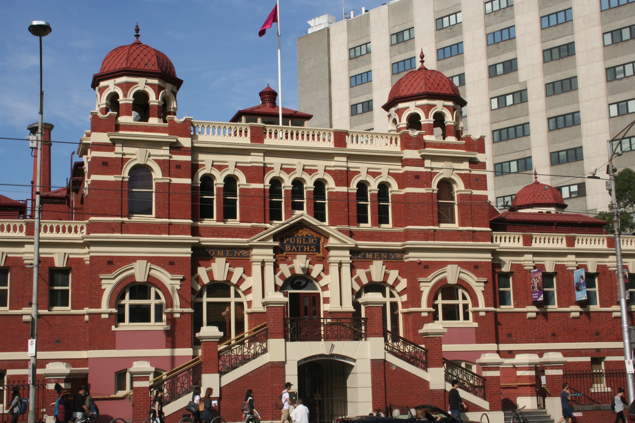 Soon the familiar landmark of the Melbourne City Baths (1903-04) comes into view on Swanston Street. This Edwardian Baroque building with its ‘blood and bandage’ colouring is certainly a lot of fun, though to modern eyes it looks overcooked. Then again, what will we be saying in a few decades about the apartments that are being built now? At least the City Baths is a solid, striking building that commands attention, and has lasted.
