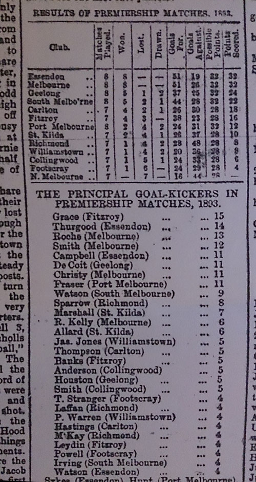 Here’s the ladder from 1893. Back then, Williamstown and Port Melbourne were playing with the big boys. Matches were low-scoring by today’s standards and there was a surprising number of draws. Poor old North Melbourne only managed 16 goals in seven games.