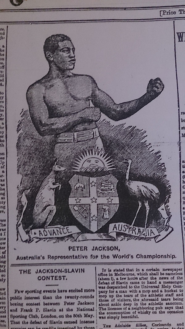 The Sportsman was obsessed with the career of ‘Melbourne’s idol’, Paddy Slavin, a heavyweight who won the championship of England and defeated some notable American fighters. His most bruising encounter was with his great Australian rival, Peter Jackson, who beat him in a contest remarkably brutal even for those days. Jackson, known as ‘the Black Prince’ was born in Jamaica but came to Australia where he commenced a very successful boxing career. I wonder if Jackson was Australia’s first black champion?