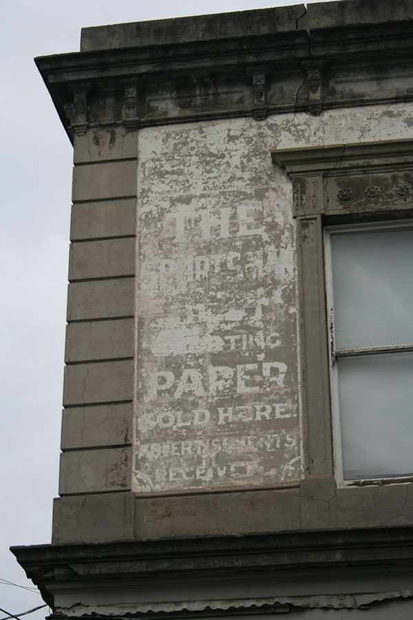 Reaching Smith Street, the boundary between Fitzroy and Collingwood, I noticed an intriguing ghostsign on the corner of Argyle Street. The words I could decipher from the faded lettering were: ‘The Sportsman – Sporting paper sold here – Advertisements received.’ There was a word or two I couldn’t be certain of, just below ‘The Sportsman’: I guessed that they might read ‘The Best’ but it’s a shot in the dark. (A sporting chance.) Of the faded purple sign to the right of The Sportsman, it is hard to make out anything at all. Until recently there was something over the top, indicated by the remnants of a metal frame. But the only legible sign on this wall belongs to a paper I’d never heard of – The Sportsman.