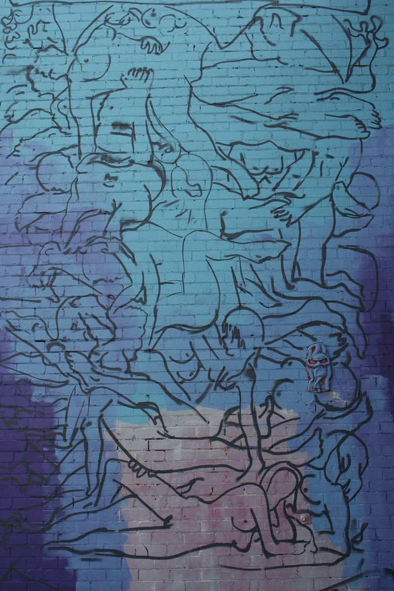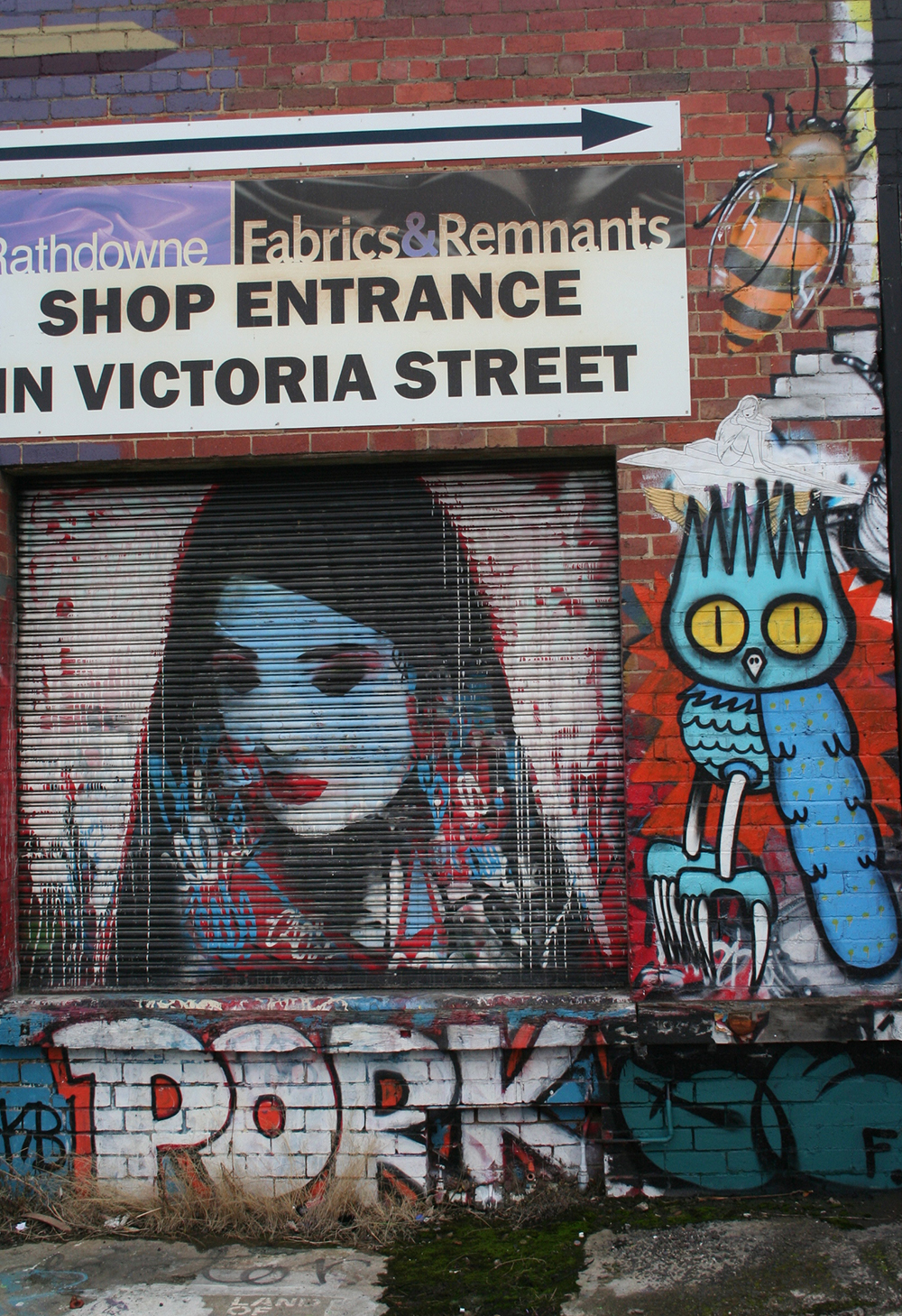 Not far away, in the side streets to the west of Lygon Street, there are some more recent additions to the walls, in form of galleries of street art. At one point I thought of calling this blog Stories on Walls and you could use these images as the starting point for many kinds of narrative – fairy tales, fantasy, erotica, surrealism, political satire. My own favourites are by Baby Guerrilla, whose flying lovers, families and musicians enhance walls in Footscray, the CBD, Brunswick and many more.
