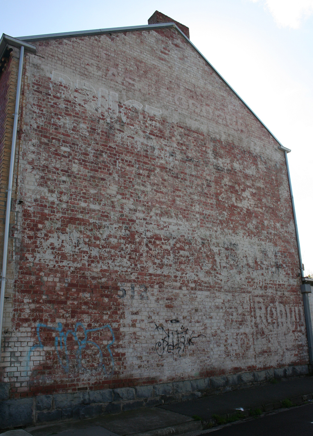I reckon I can also make out the name ‘Bruce’ and words ‘Cash grocer’. The rest of the wall gives the impression that it was covered in signs at one point, but time and weather have done their job and nearly everything has washed away. We can imagine the brands that might have been visible here – Bushells tea, McAlpins flour, perhaps Ecks lemonade or Velvet Soap. Now, almost nothing. Even the faint taste of Robur may be gone in a few more years. This is what happens when ghostsigns are completely exposed to the elements.