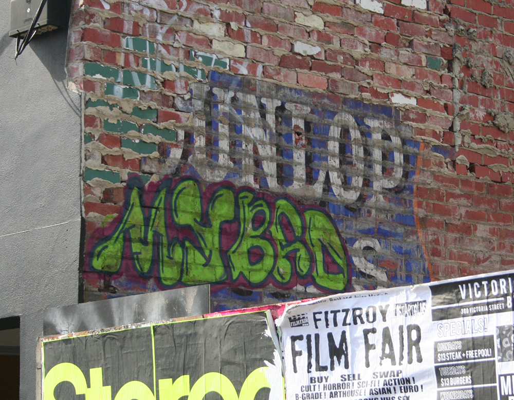 There’s a good example of that at 296 Lygon Street, almost opposite the deco house, where a Dunlop tyres sign reappeared recently. Unfortunately it’s been vandalised but you can still see the bright colours.